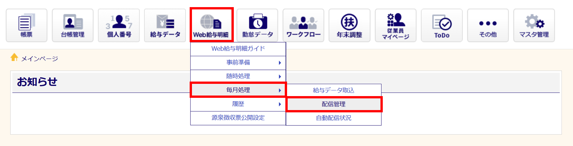 [Web給与明細]>[毎月処理]>[配信管理]をクリックします。