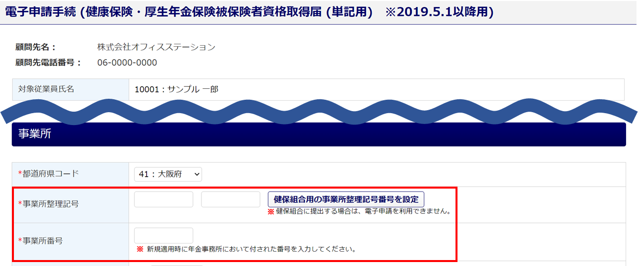 社会保険資格取得届の電子申請時、「事業所整理記号」と「事業所番号」は必須項目のため省略できません。そのため、同時に申請することはできません。社会保険資格取得届の電子申請については、各番号等が発行されてから申請してください。※ダミー番号で申請可能か等のお問い合わせについては、当社ではわかりかねます。 恐れ入りますが、提出先の日本年金機構へお問い合わせをお願いいたします。