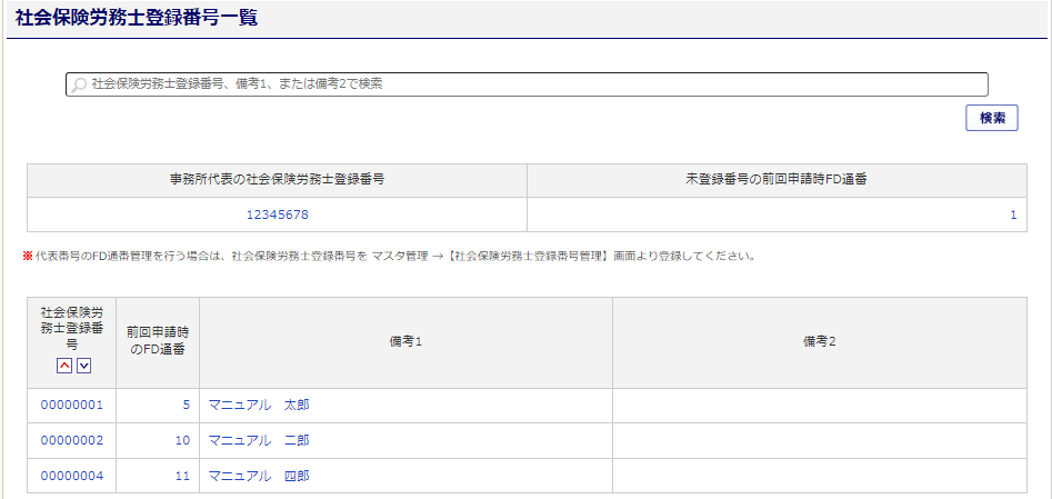 また、[検索](②)をクリックすると、社会保険労務士登録番号一覧が表示され[事務所設定]に登録している「社労士登録番号 / 税理士登録番号」と[社労士登録番号管理]に登録した情報から選択することができます。