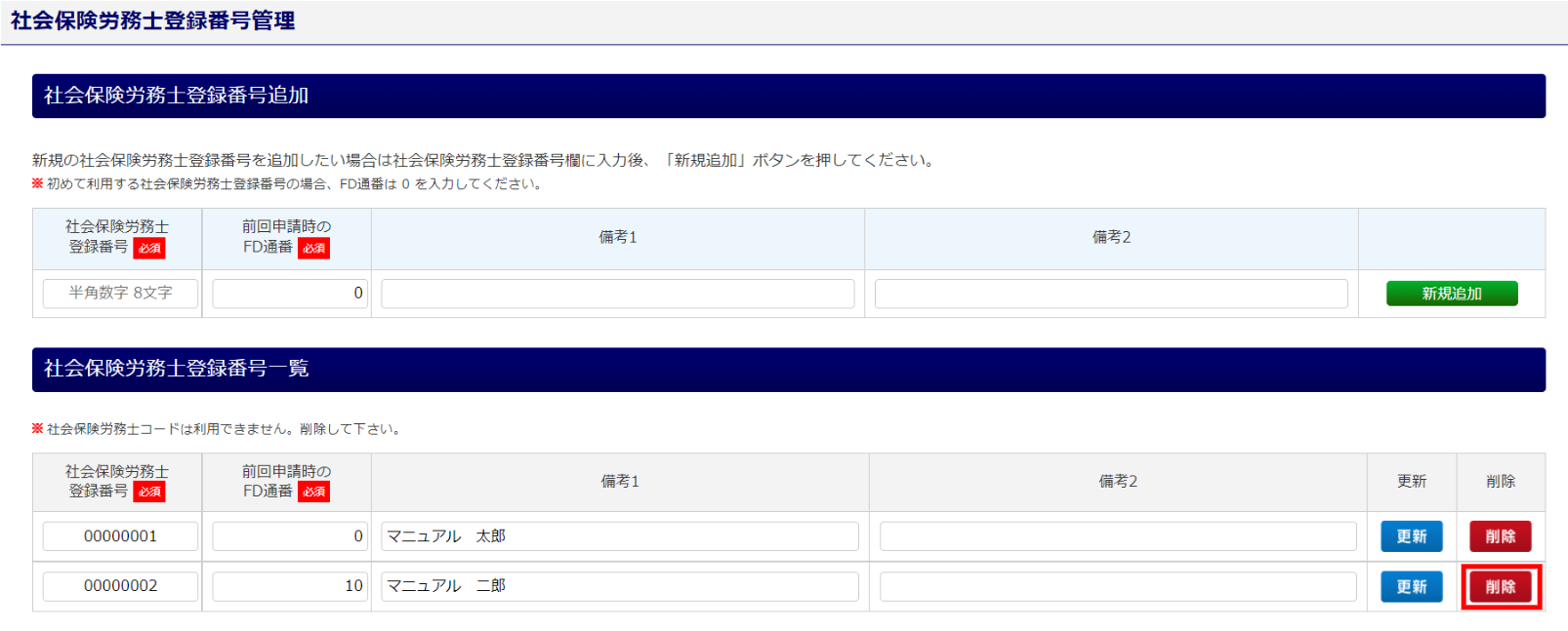 【補足】登録済み社労士登録番号管理の削除