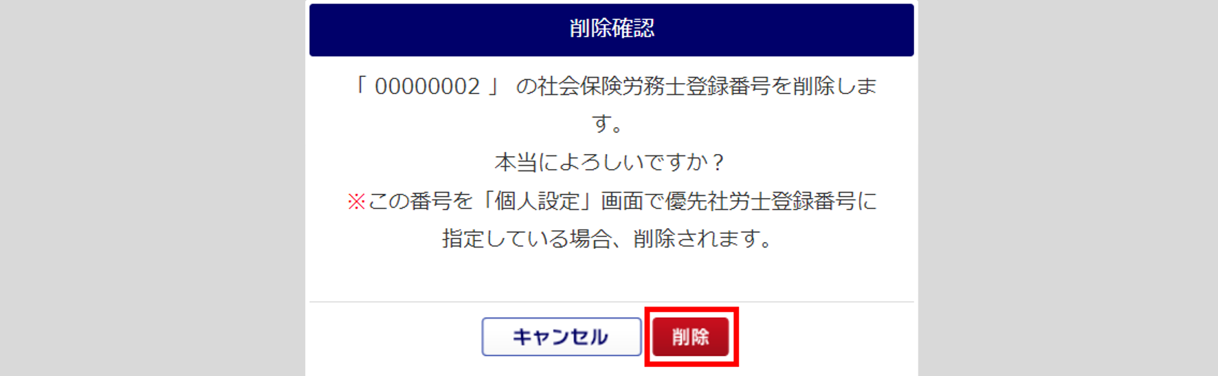 削除する社労士登録番号管理の社会保険労務士登録番号が、[個人設定]にて「優先社労士登録番号」に設定されている場合、情報が削除されます。