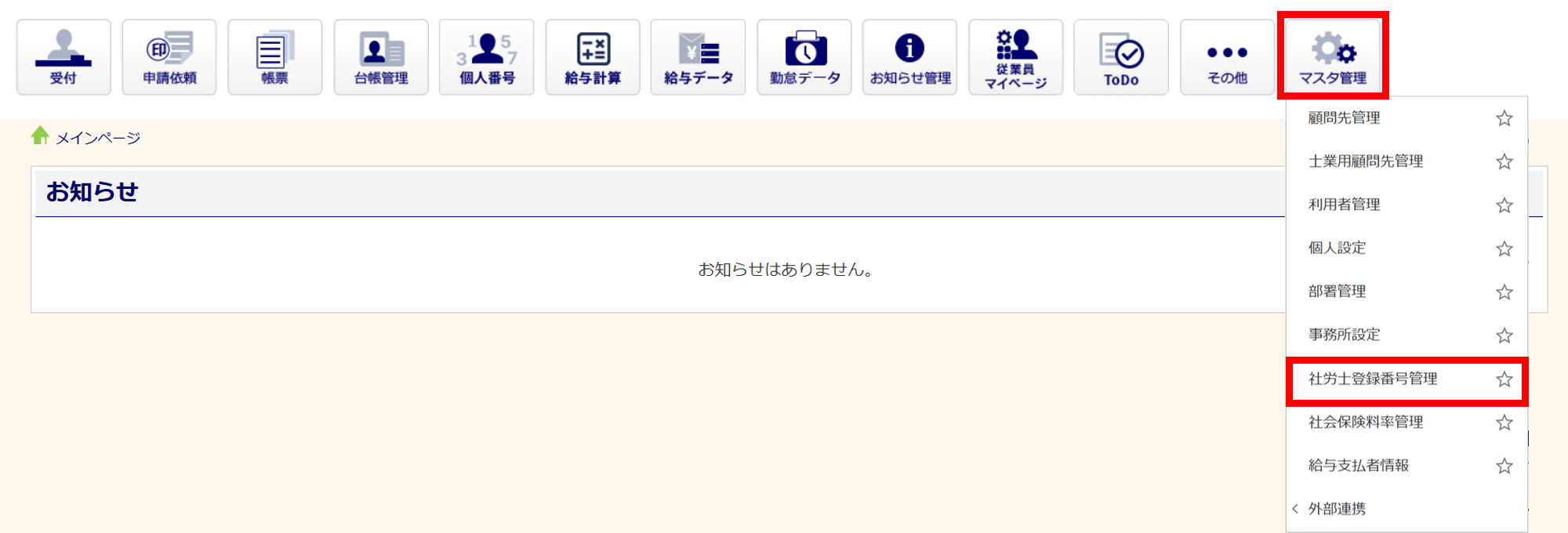 [マスタ管理]>[社労士登録番号管理]をクリックします。