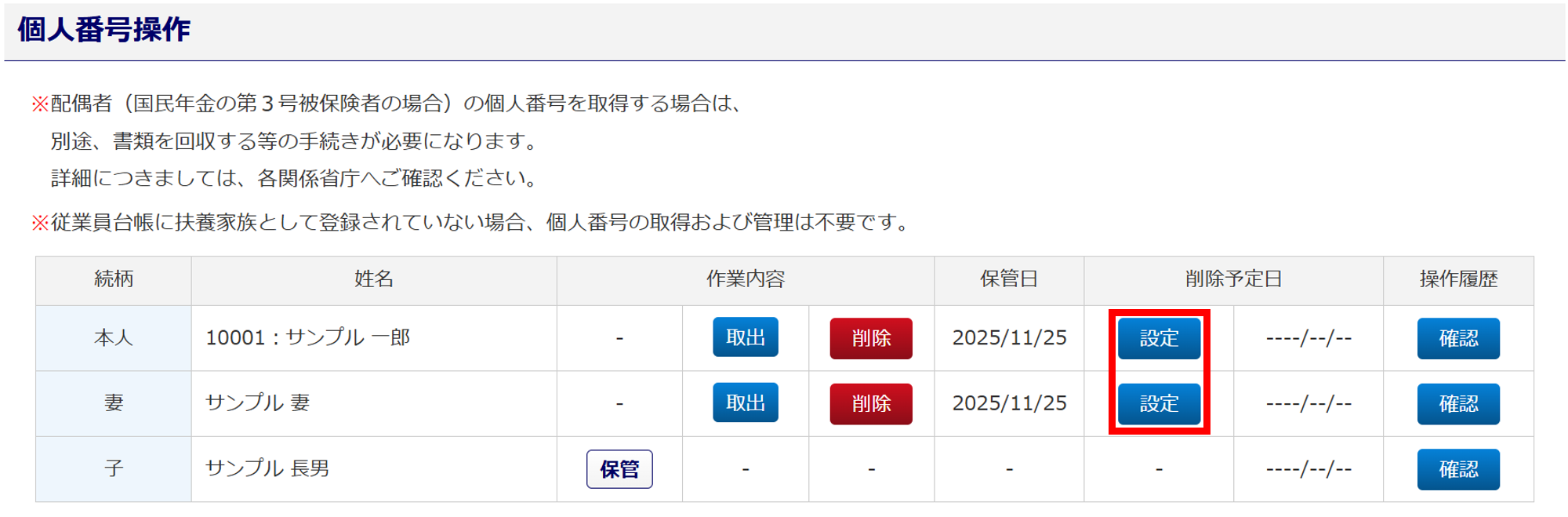 個人番号の「削除予定日」を設定し、[設定]をクリックします。