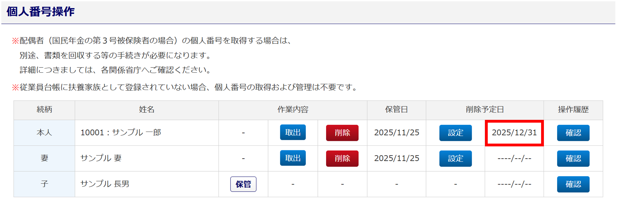 「削除予定日」が到来した際には、手動で個人番号(マイナンバー)の削除操作をおこなってください。