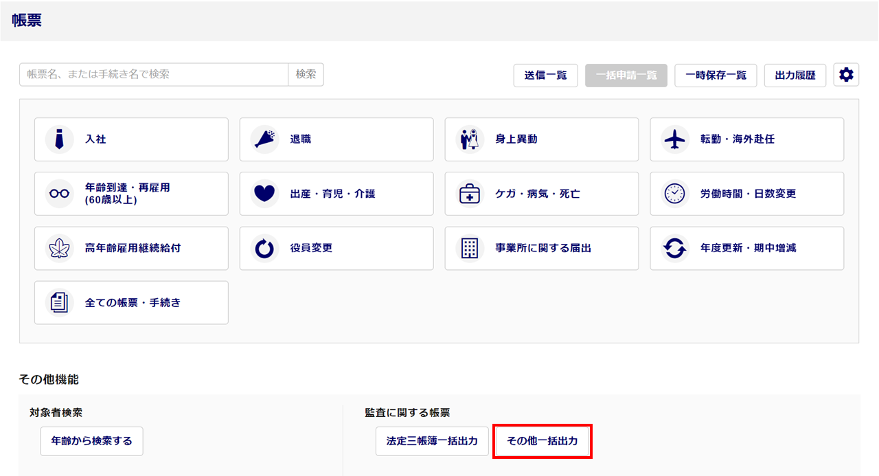 「その他機能:監査に関する帳票」カテゴリの[その他一括出力]をクリックします。