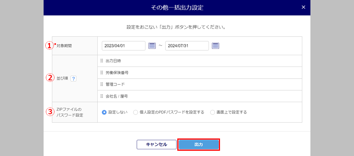 | ③ | ZIPファイルのパスワード設定 | 出力するZIPファイルのパスワードについて設定します。 |