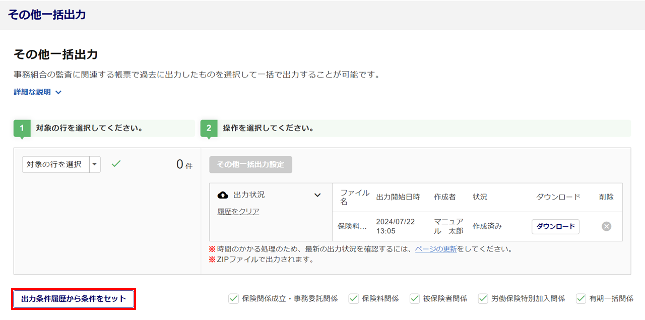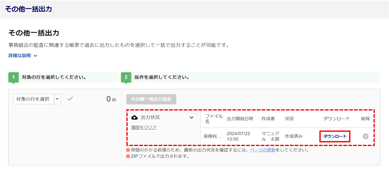 「出力状況」欄が表示され、「状況」が「作成済み」になるとダウンロードが可能となります。