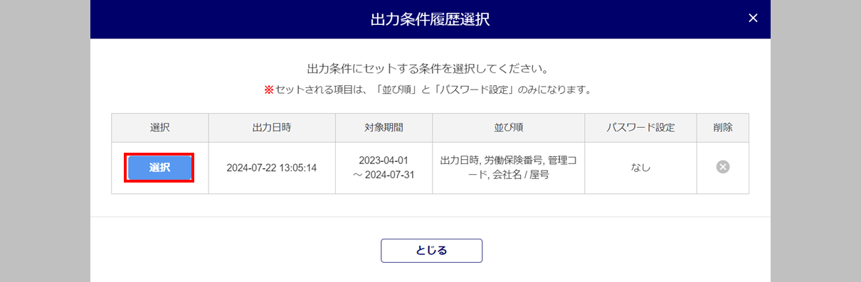出力条件にセットする条件の[選択]をクリックすると、出力条件(選択した帳票、並び順、ZIPファイルのパスワード設定)がセットされます。