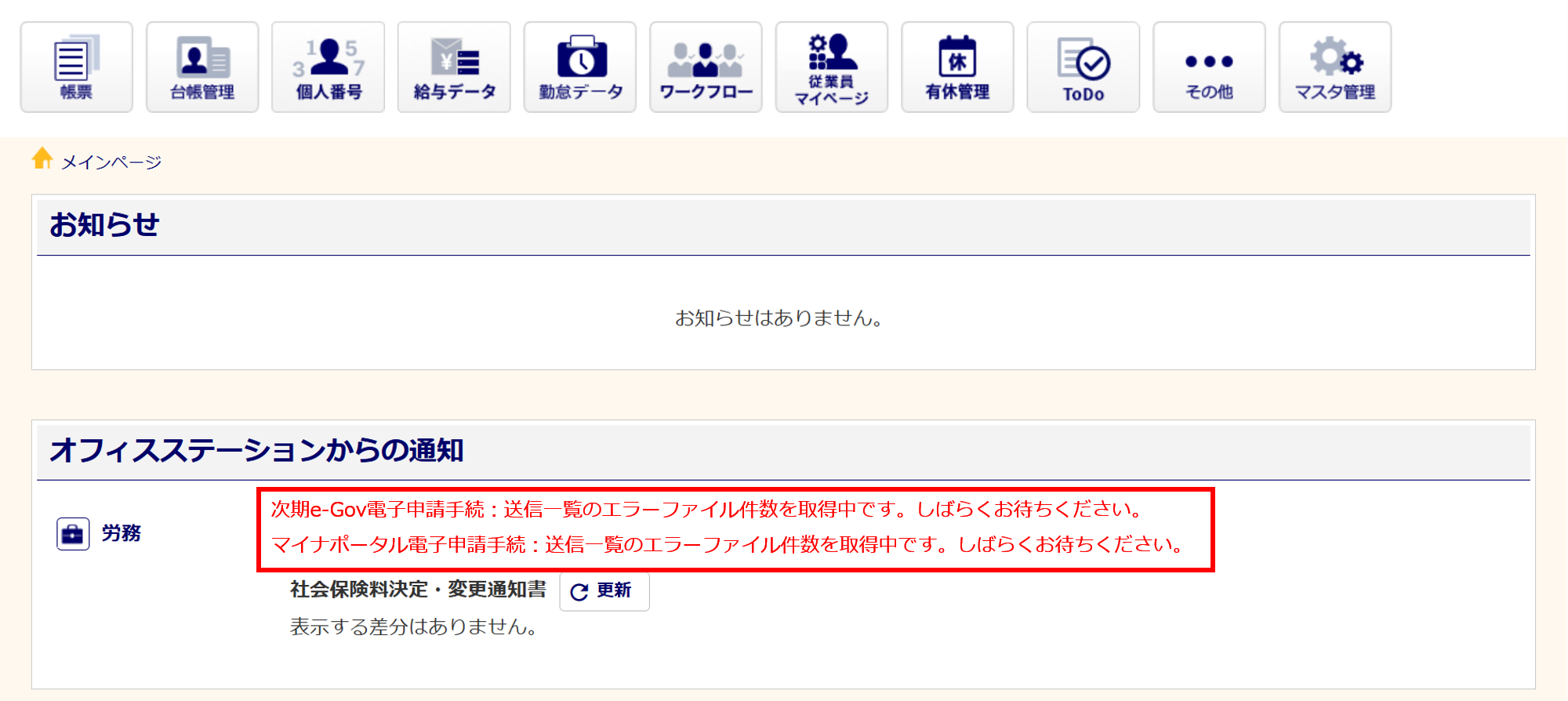 メインページの「オフィスステーションからの通知」欄に表示されている[雇用継続給付対象者一覧へ移動する]をクリック時に、エラーが生じる可能性がございます。
