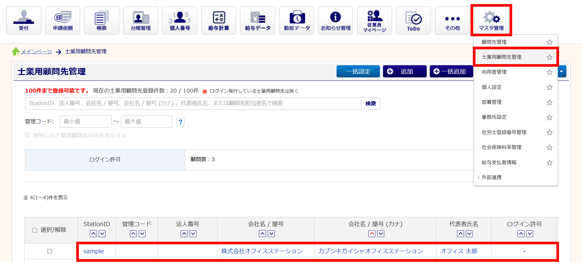 [マスタ管理]>[士業用顧問先管理] >対象の顧問先企業をクリックします。