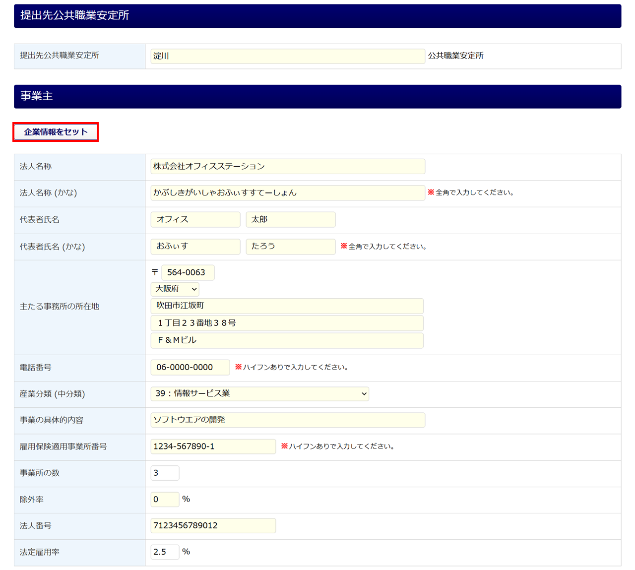 ※[企業情報をセット]から反映された項目は、入力フォーム部分が黄色になります。