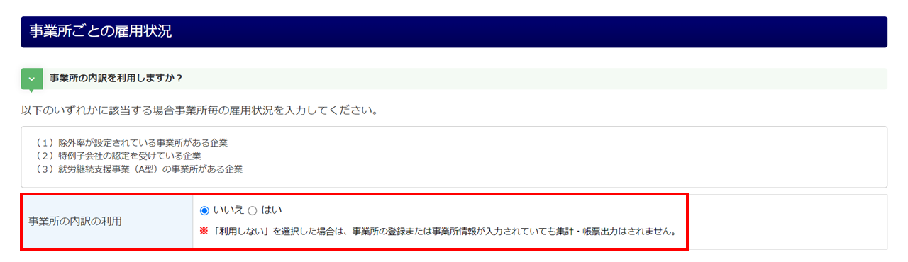 「事業所の内訳の利用」に「いいえ」を選択した場合