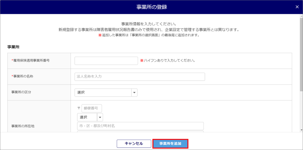 事業所情報を入力し、[事業所を追加]をクリックします。
