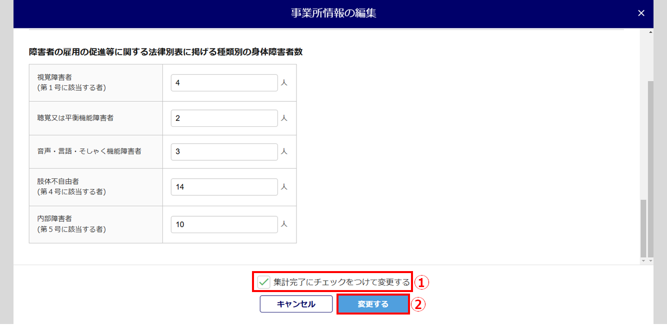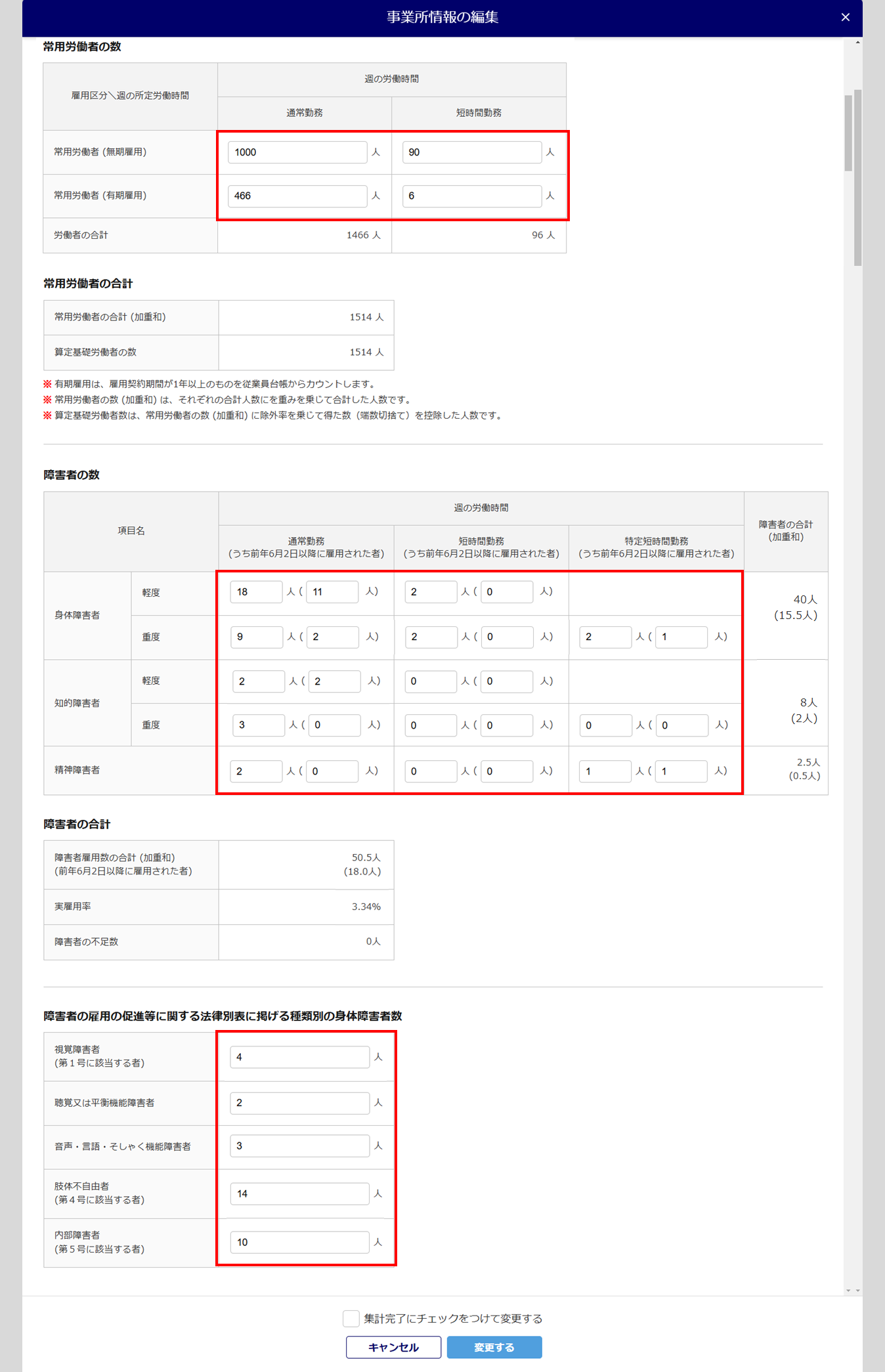 「常用労働者の数」「障害者の数」「障害者の雇用の促進等に関する法律別表に掲げる種類別の身体障害者数」欄には、従業員台帳から該当事業所に所属している従業員の情報を集計し、セットされます。