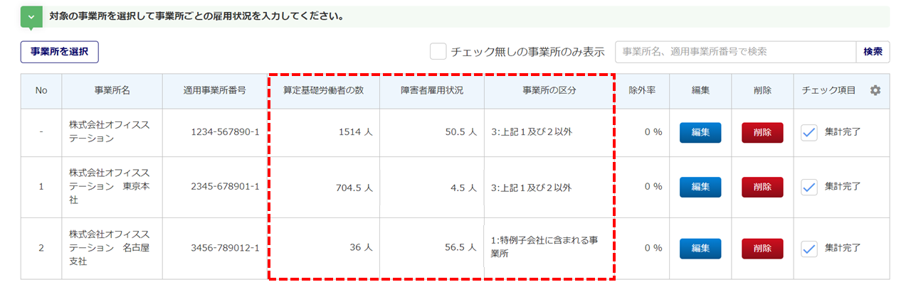 「編集」列の[編集]をクリックし、事業所ごとに雇用状況を入力します。