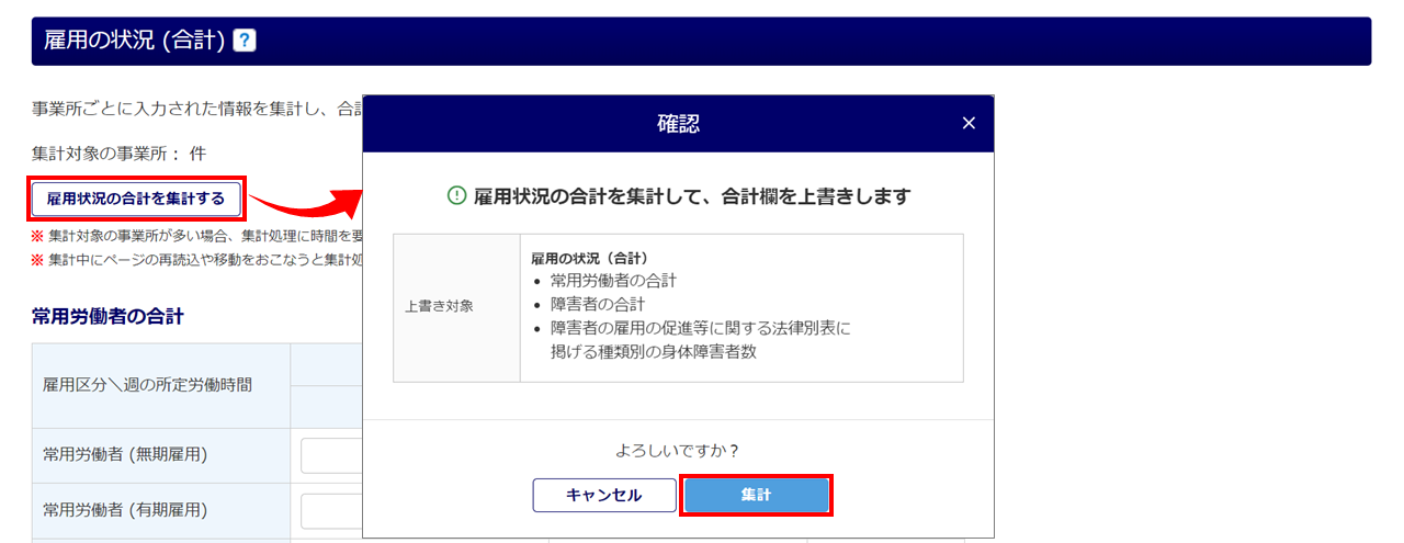 [雇用状況の合計を集計する]>[集計]をクリックします。