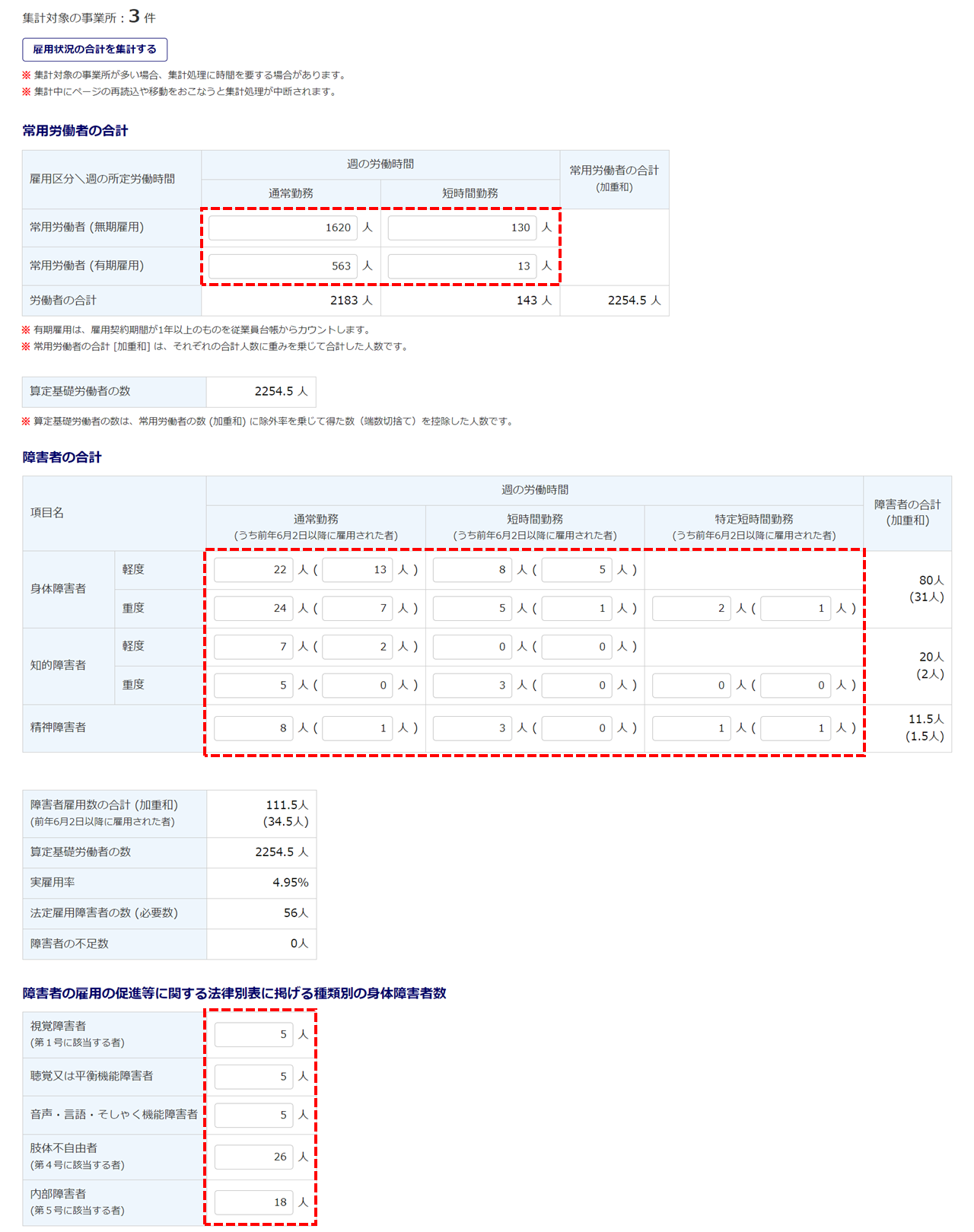 「事業所ごとの雇用状況」欄の情報が集計され、「常用労働者の合計」「障害者の合計」「障害者の雇用の促進等に関する法律別表に掲げる種類別の身体障害者数」に反映されます。