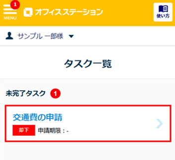 「タスク一覧」に未完了タスクとして、承認ステータスは「却下」の状態で表示されます。
