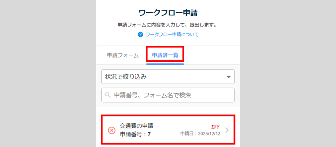 「タスク一覧」に未完了タスクとして、承認ステータスは「却下」の状態で表示されます。