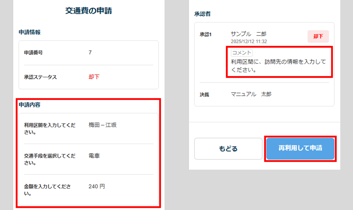 申請内容と却下に関する「コメント」を確認し、[再利用して申請]をクリックします。