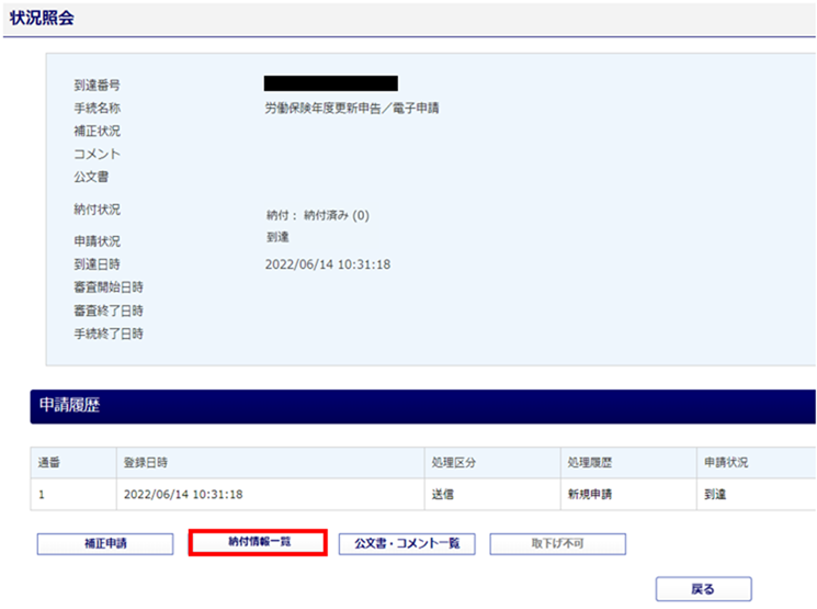 「送信一覧」画面の[状況照会]の[納付情報一覧]もしくは[公文書・コメント一覧]から、電子納付に必要な情報をご確認いただけます。