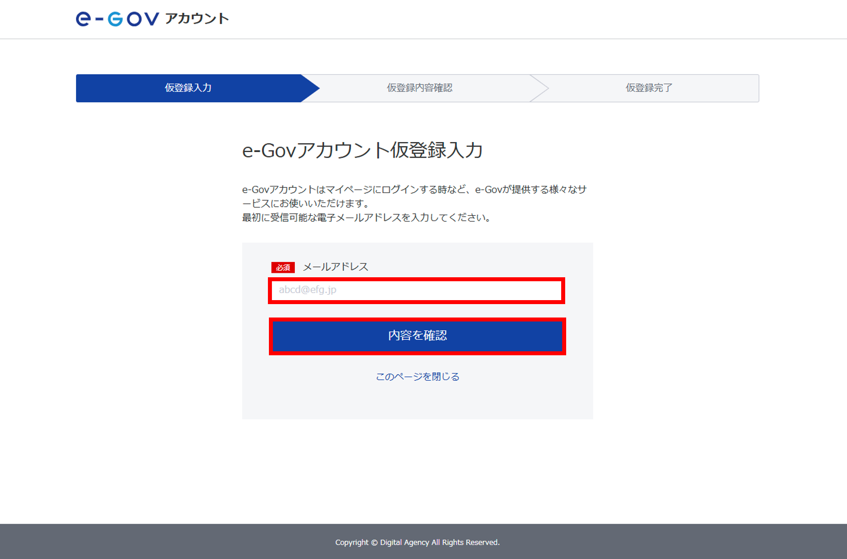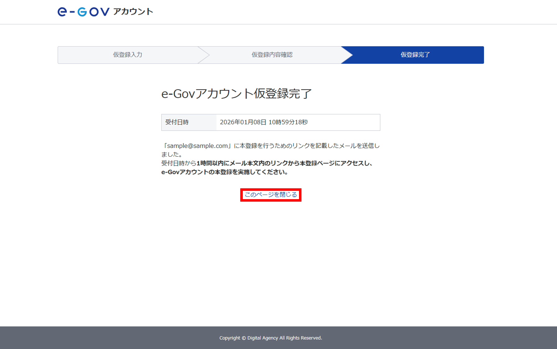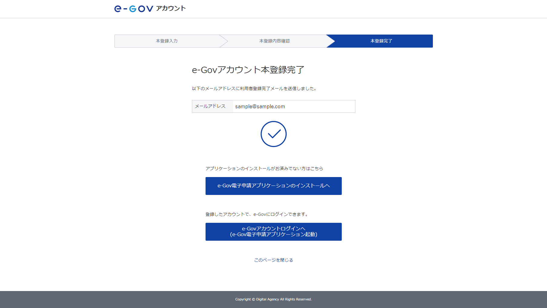 「e-Govアカウント仮登録完了」と表示されたら、[このページを閉じる]をクリックします。