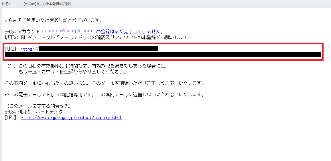 e-Govから「[e-Gov]アカウント本登録のご案内」のメールが届きますので、メールに記載されているURLをクリックします。