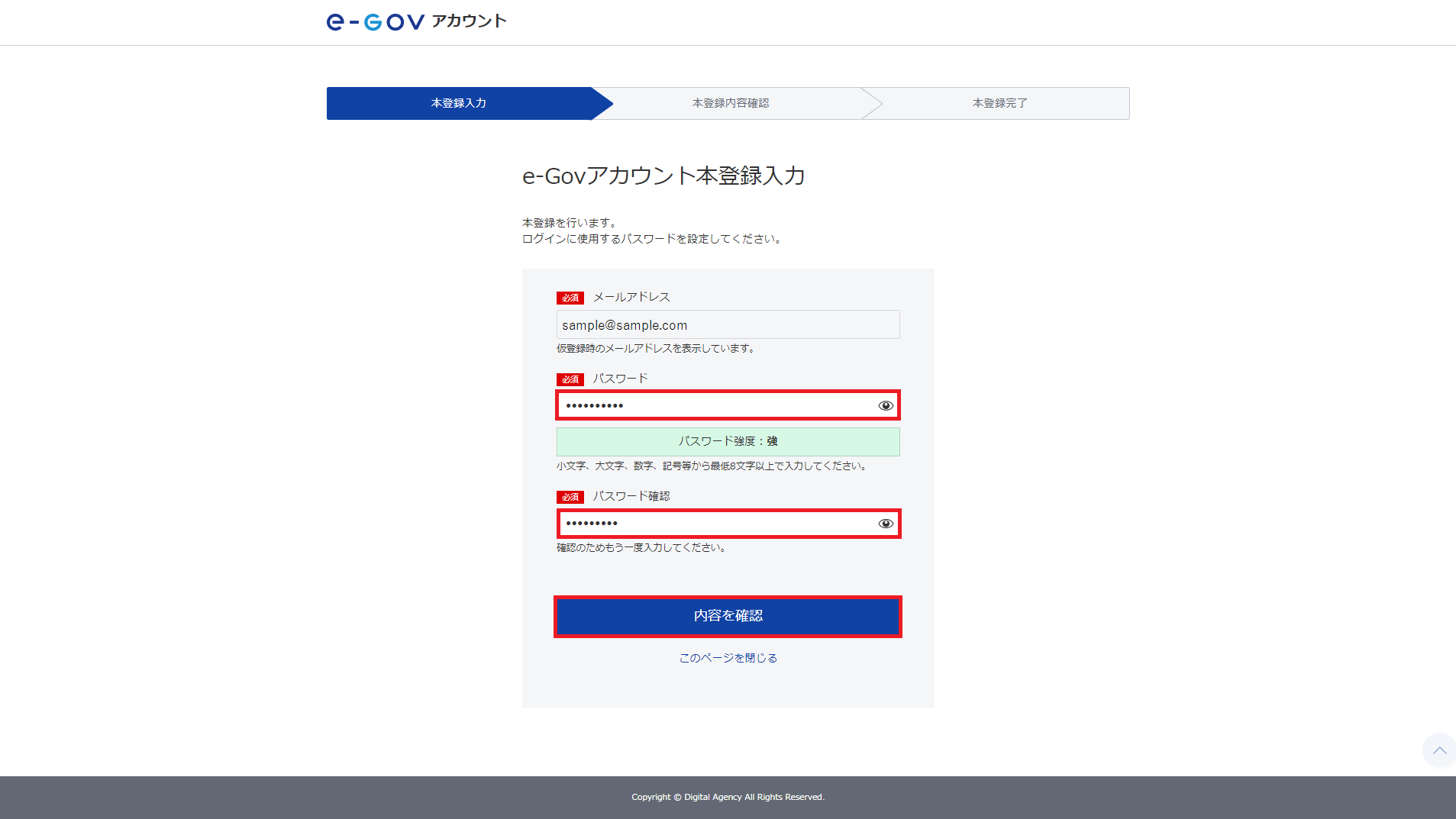 パスワードを2回入力し、[内容を確認]をクリックします。