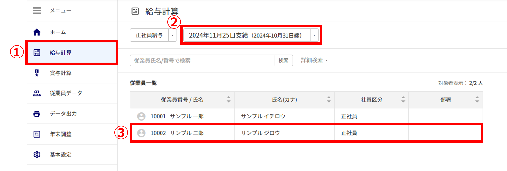 対象の支給月(①)を選択し、対象の従業員(②)をクリックします。