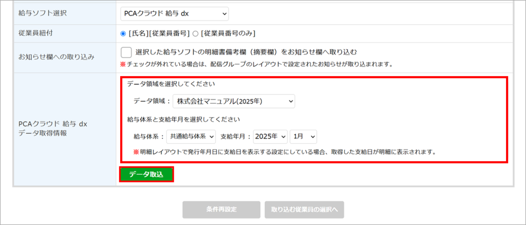 「PCAクラウド 給与 dx データ取得情報」を入力し、[データ取込]をクリックします。