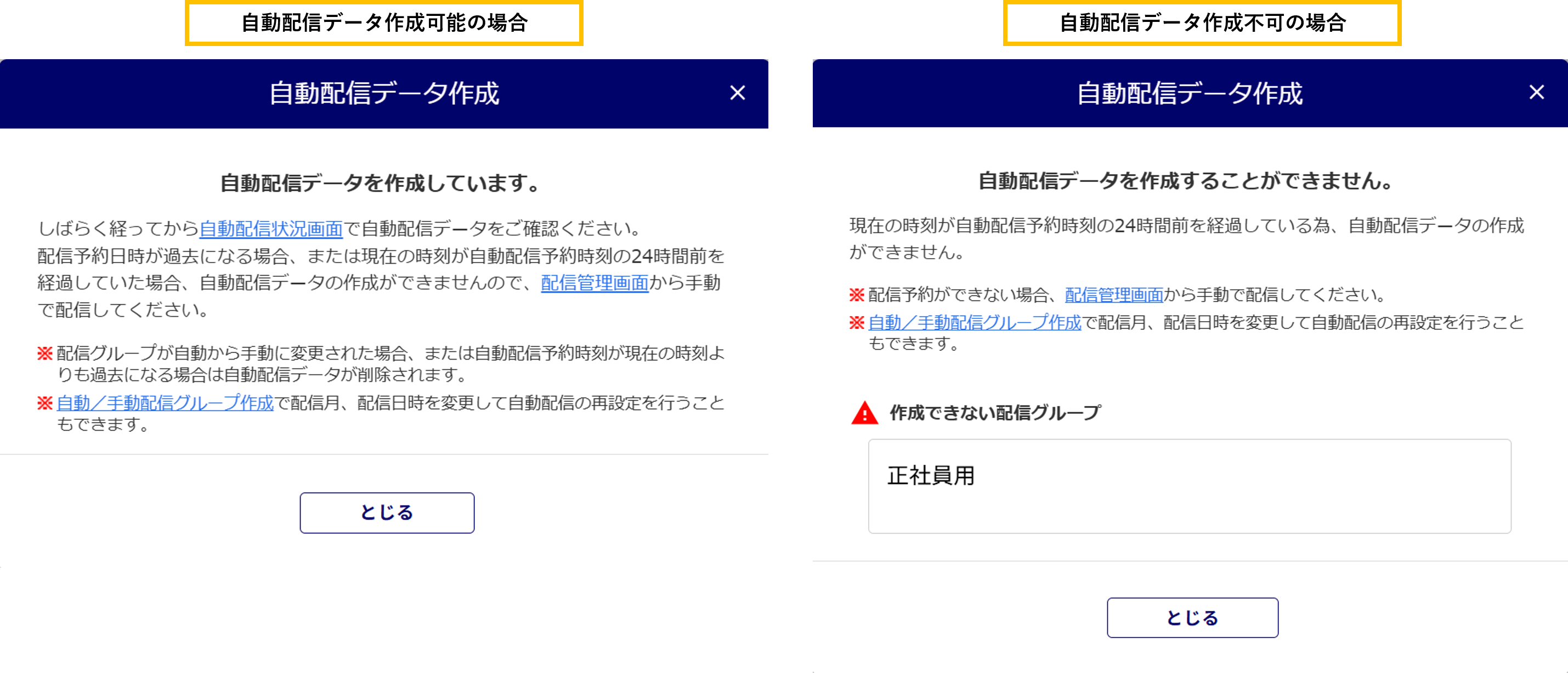 「配信方法」が「自動」の配信グループを設定している従業員を選択した場合、「自動配信データ作成」画面が表示されます。「自動配信データを作成することができません。」と表示された場合は、画面の指示に従って配信の設定を修正してください。