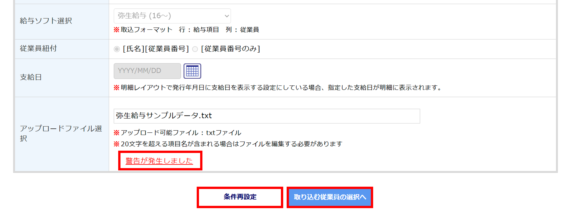 ※「給与ソフト選択」にAPI連携ソフトを選択すると、[ファイルの選択]が表示されない場合があります。