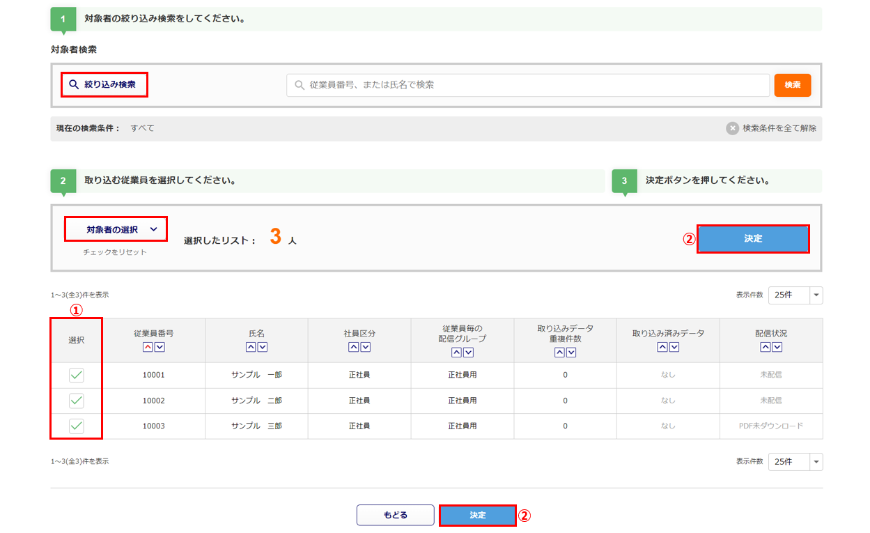 給与データを取り込む従業員の「選択」列() にチェックをつけ、[決定]()をクリックします。