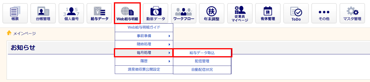 [Web給与明細]>[毎月処理]>[給与データ取込]をクリックします。