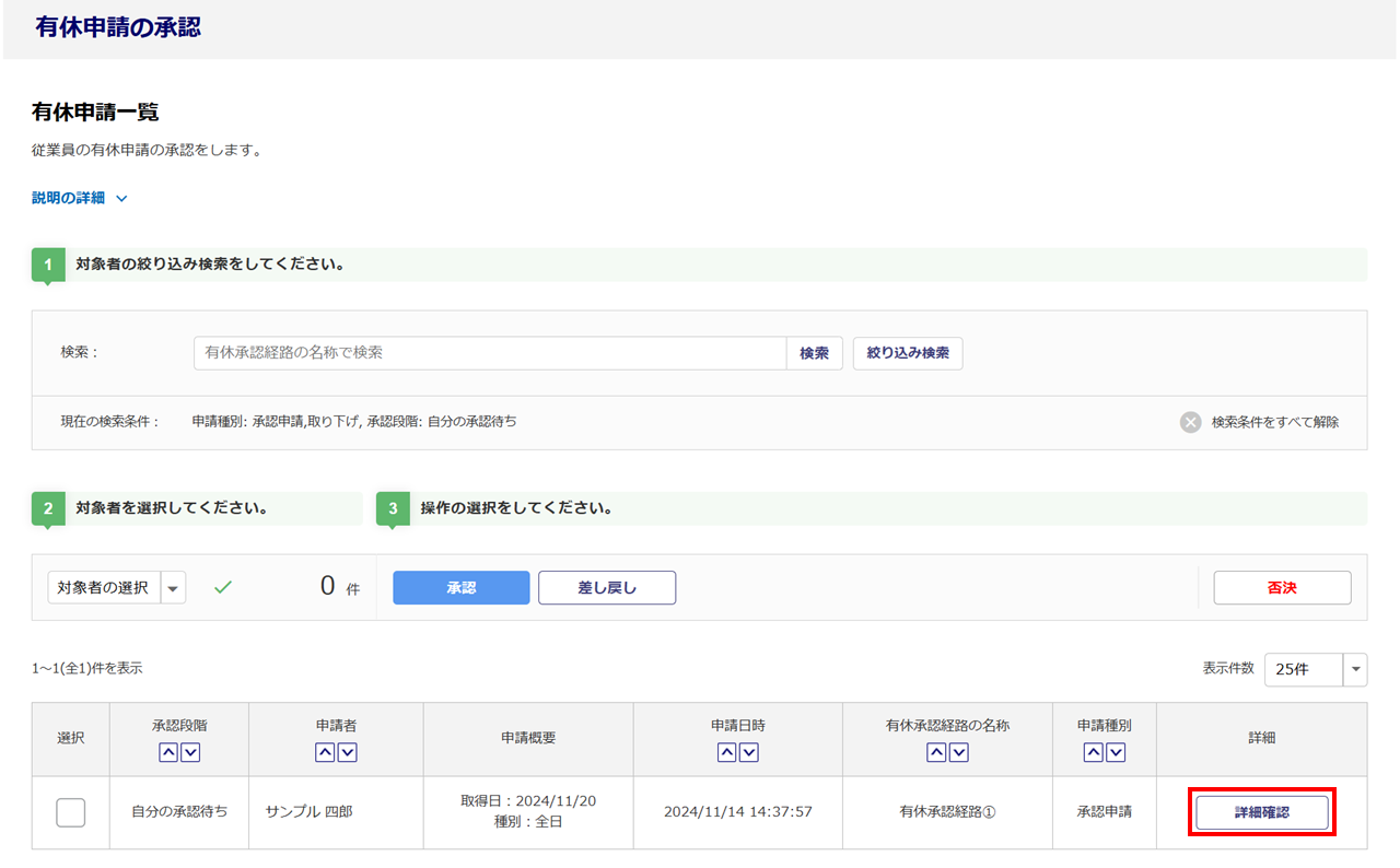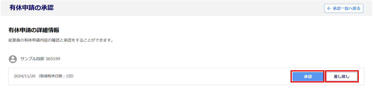 従業員からの有休申請の情報を個別に確認し、承認または差し戻しをおこないます。
