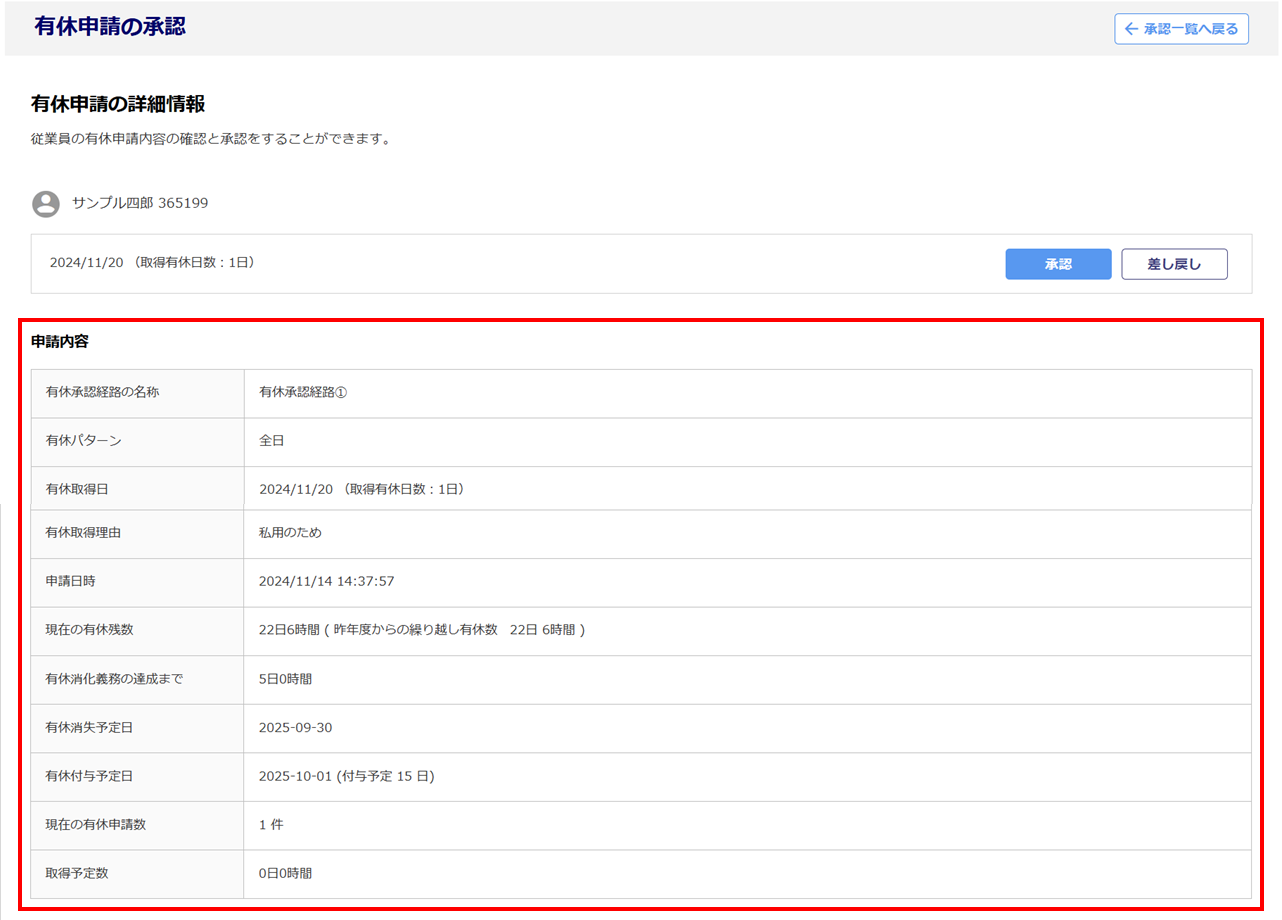 「有休申請の詳細情報」画面に遷移します。「申請内容」欄を確認します。