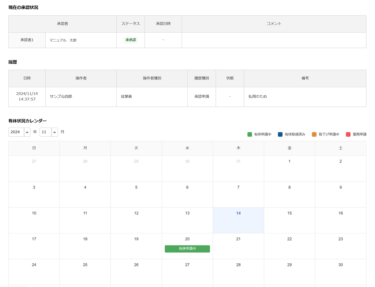 その他に、「現在の承認状況」「履歴」「有休状況カレンダー」を確認することができます。