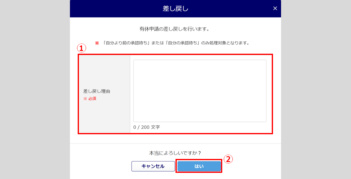 「差し戻し理由」()を入力し、[はい]()をクリックします。「差し戻し理由」は必須入力です。