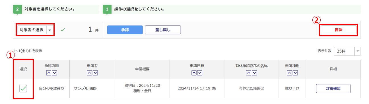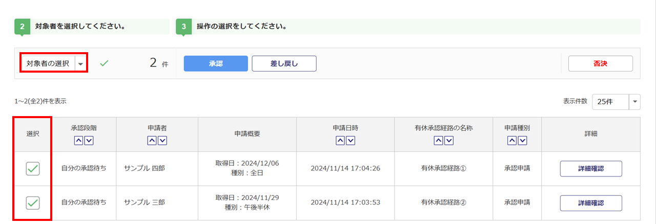 否決対象の申請の「選択」列()をチェックし、[否決]()をクリックします。[対象者の選択]から一括でチェックの付け外しが可能です。