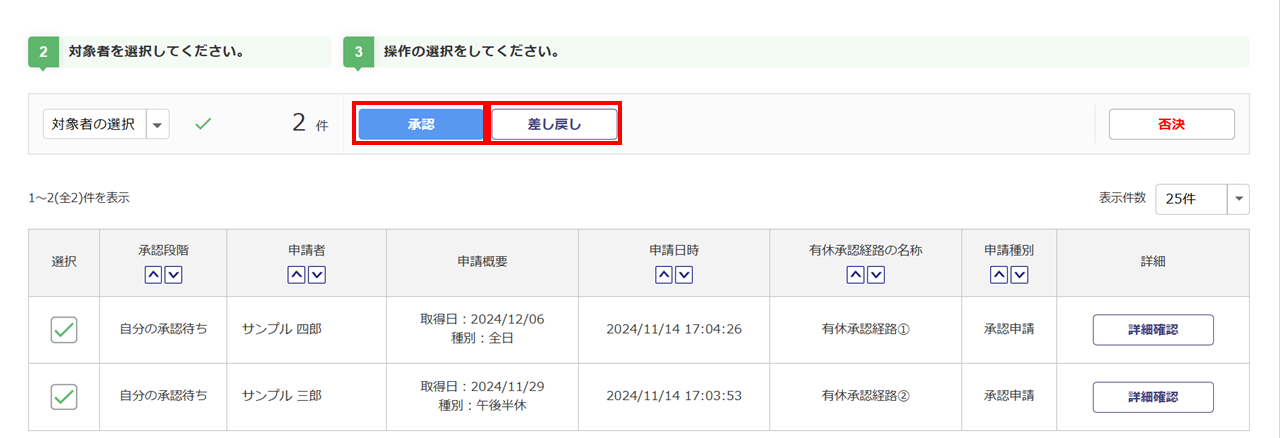 一括で承認・差し戻し