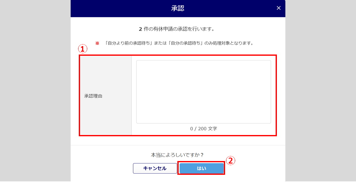 「承認理由」(①)を入力し、[はい]()をクリックします。
