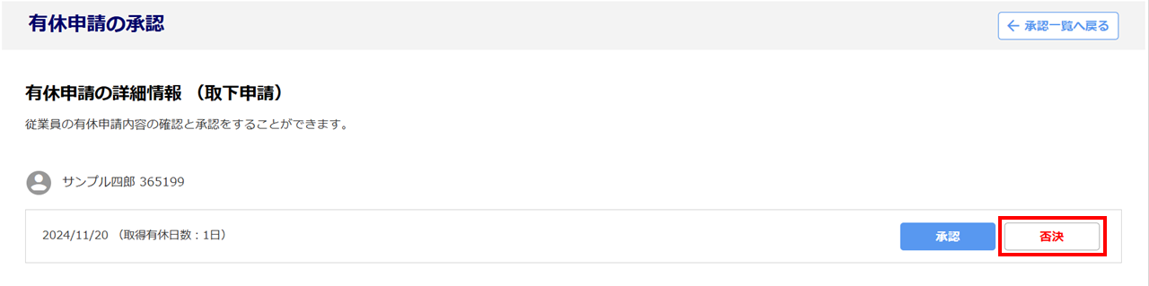 従業員からの有休取下げ申請の情報を個別に否決をおこないます。