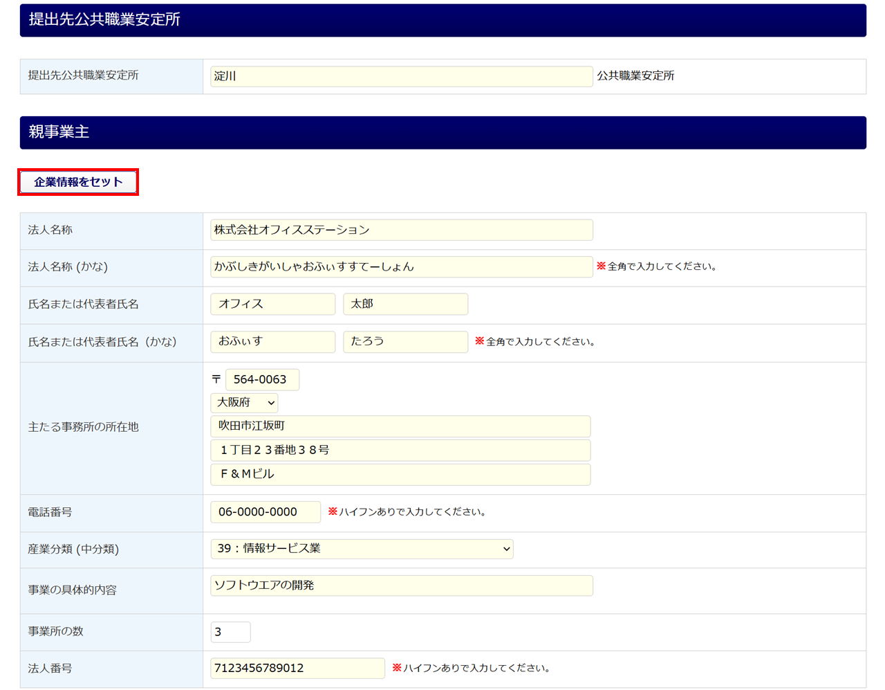 ※[企業情報をセット]から反映された項目は、入力フォーム部分が黄色になります。内容を確認し、必要に応じて修正します。