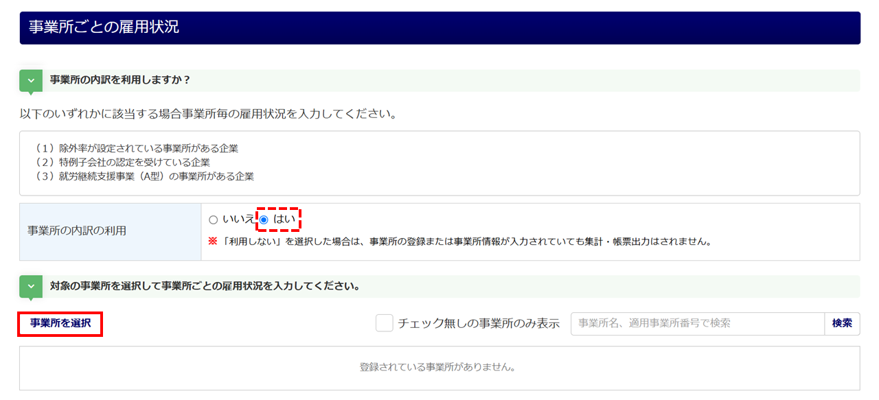 - 「事業所の内訳の利用」に「はい」を選択した場合