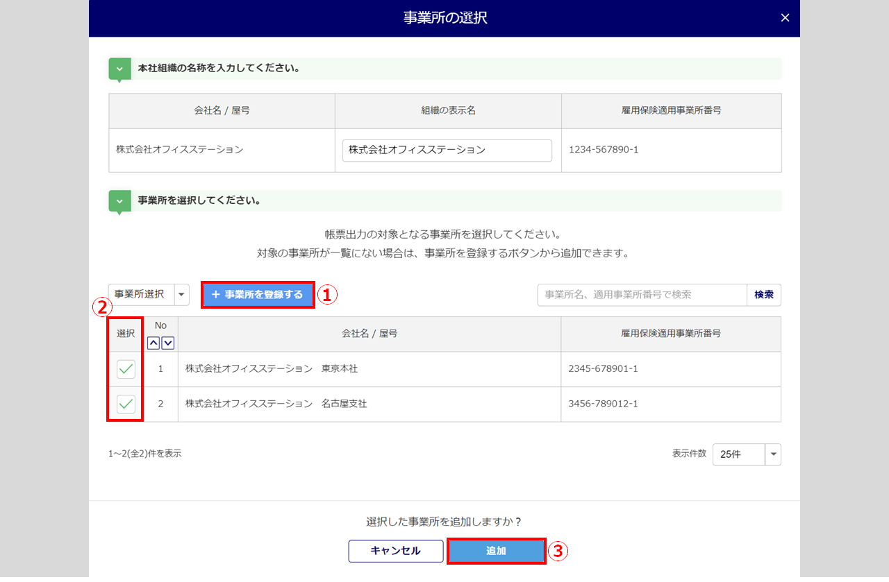 帳票出力の対象とする事業所の「選択」列(②)にチェックし、[追加](③)をクリックします。