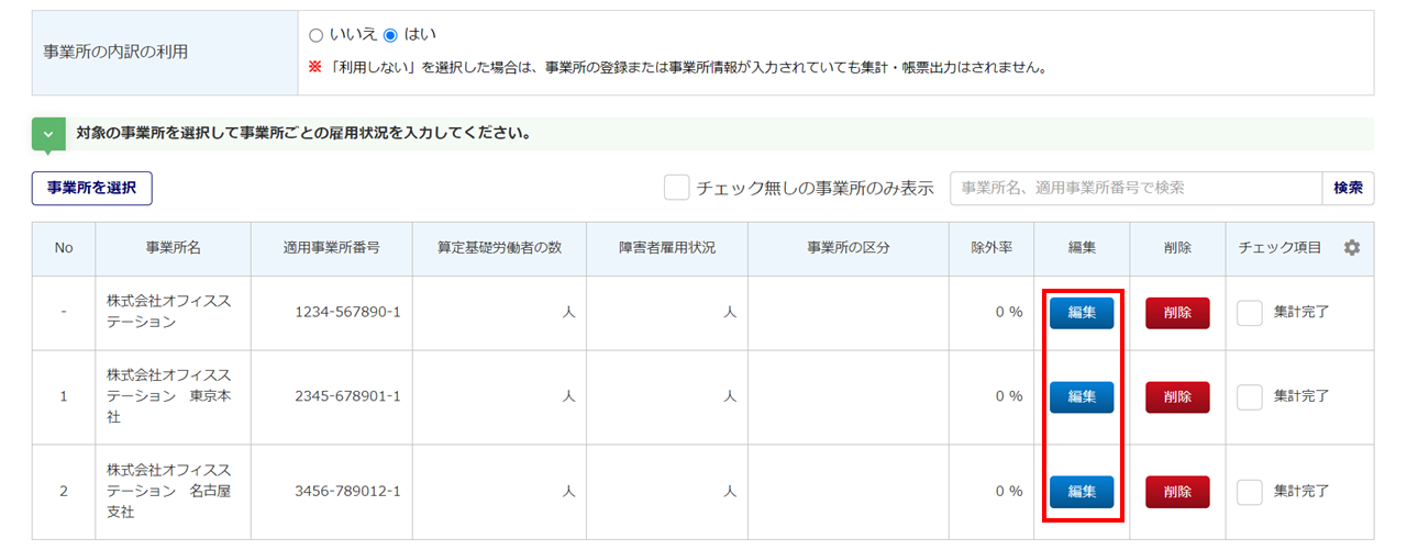 本社組織と選択した事業所が一覧に表示されます。事業所ごとに雇用状況を入力します。「編集」列の[編集]をクリックします。