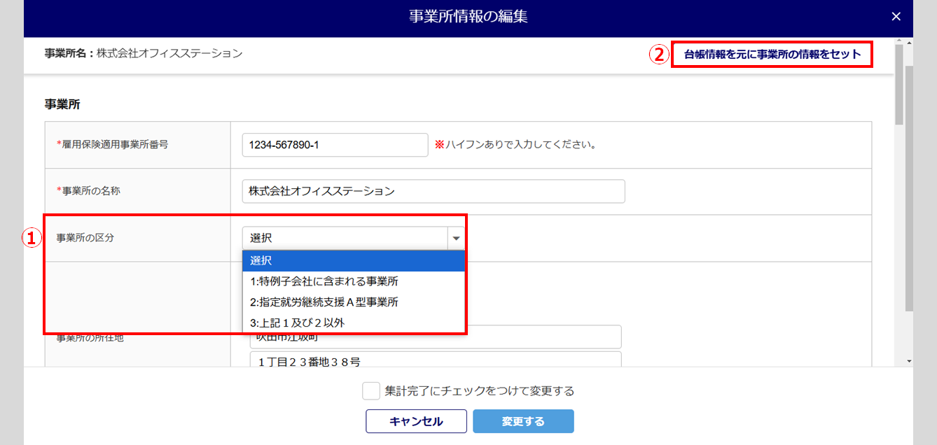 「事業所の区分」(①)を設定し、[台帳情報を元に事業所の情報をセット](②)をクリックします。