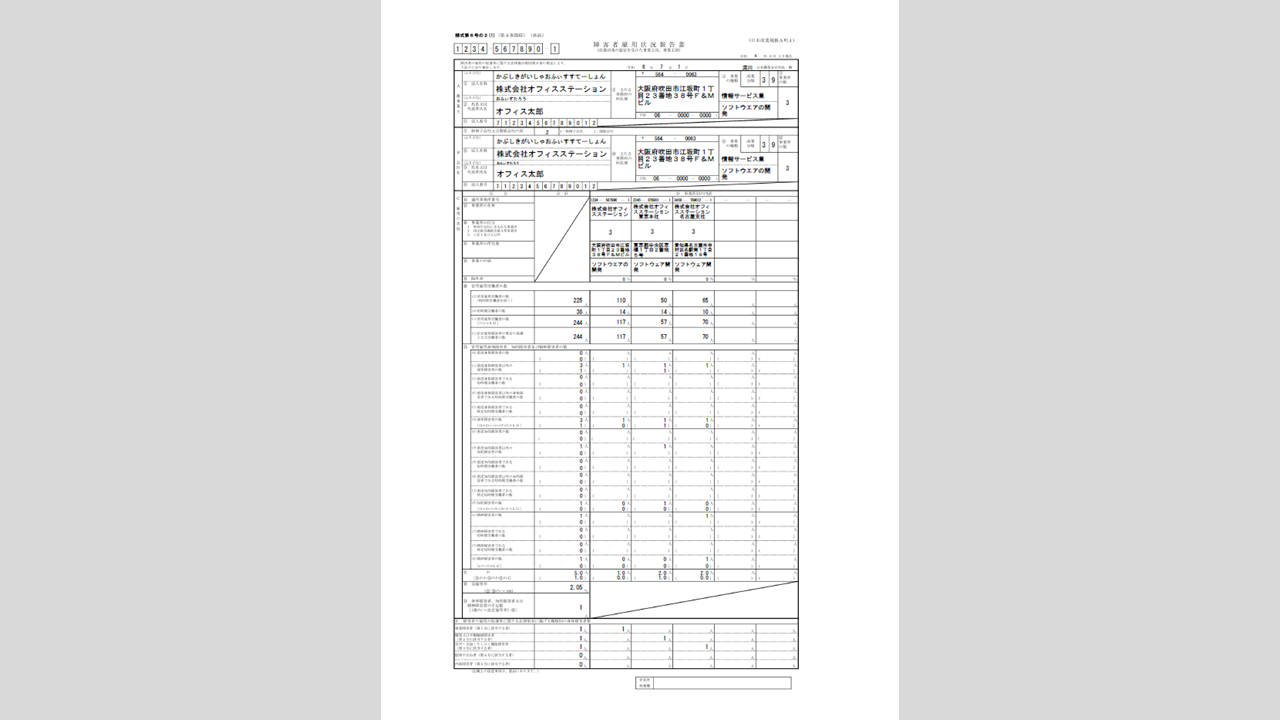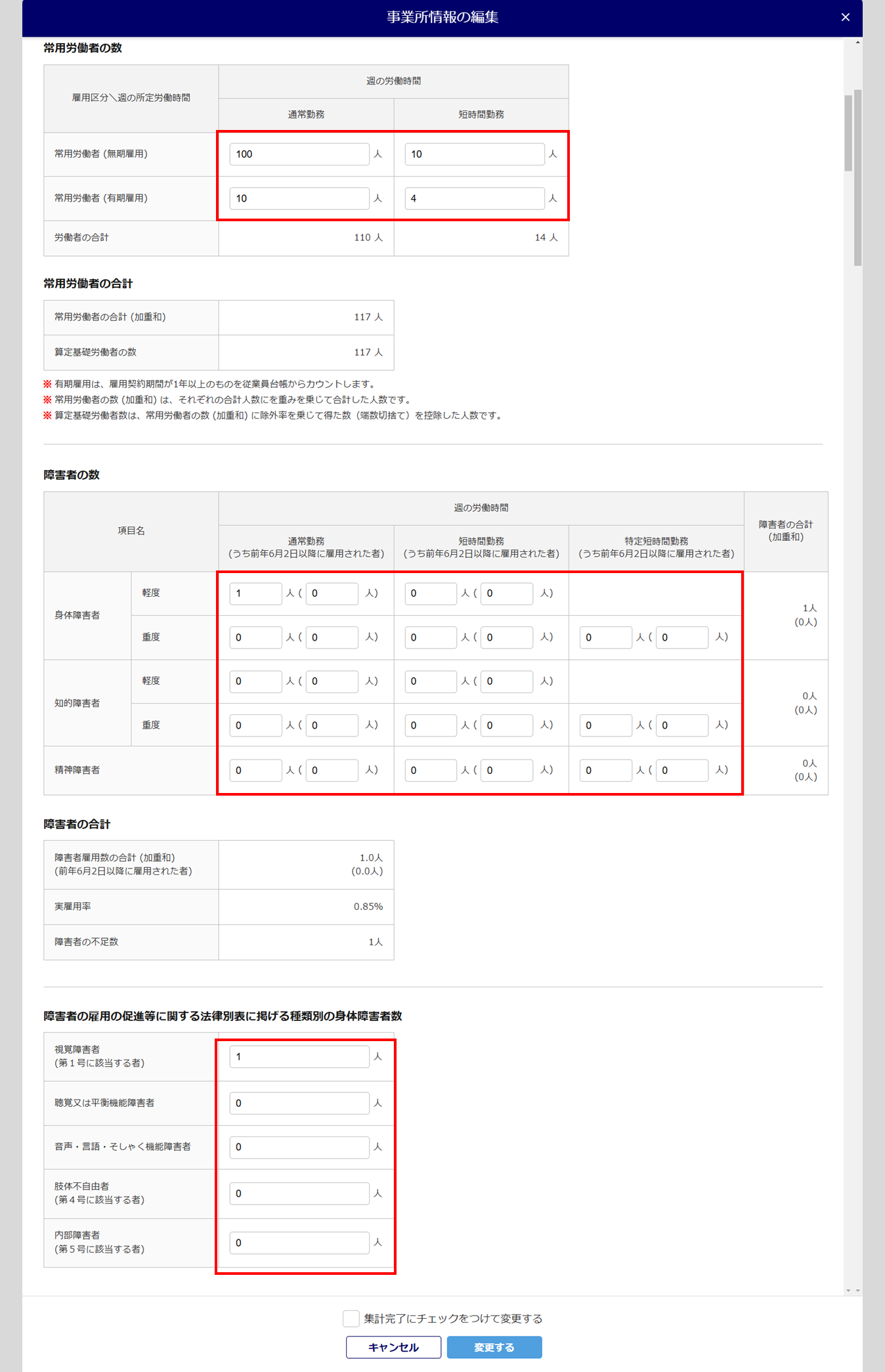 「常用労働者の数」「障害者の数」「障害者の雇用の促進等に関する法律別表に掲げる種類別の身体障害者数」欄には、[台帳情報を元に事業所の情報をセット]クリック後に、従業員台帳から該当事業所に所属している従業員の情報を集計し、セットされます。合計項目についてはセットした情報から計算されます。