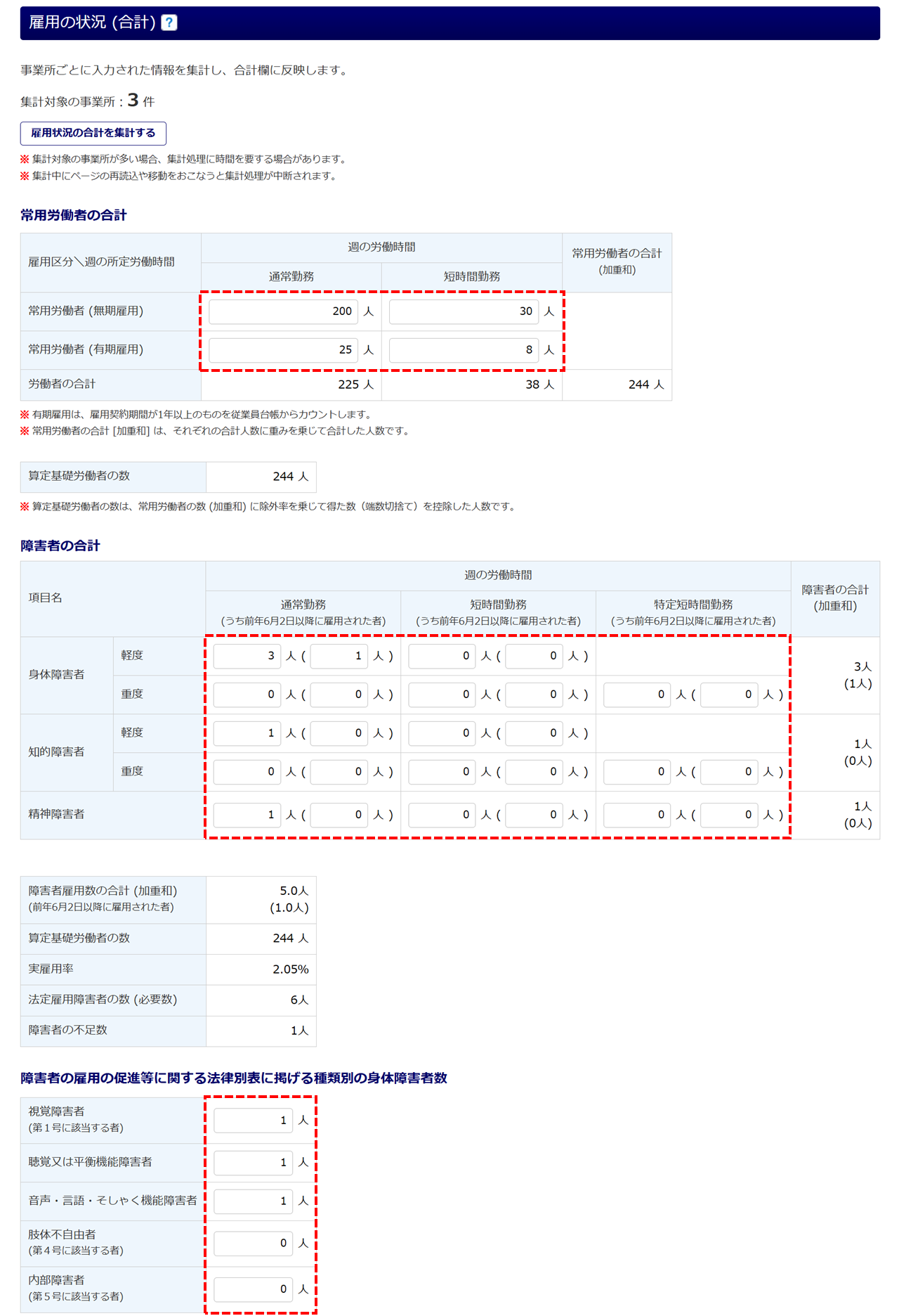 「事業所ごとの雇用状況」欄の情報が集計され、「常用労働者の合計」「障害者の合計」「障害者の雇用の促進等に関する法律別表に掲げる種類別の身体障害者数」に反映されます。