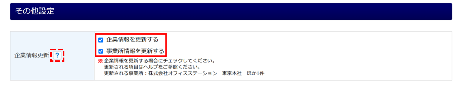 「会社名」欄の[企業情報をセット]をクリックすると、画面下部に「その他設定」欄が表示され、「会社名」欄に入力した情報を「企業設定」もしくは「士業用顧問先管理」に、また、「事業所ごとの雇用状況」にて入力した情報を「他事業所管理」に更新することができます。